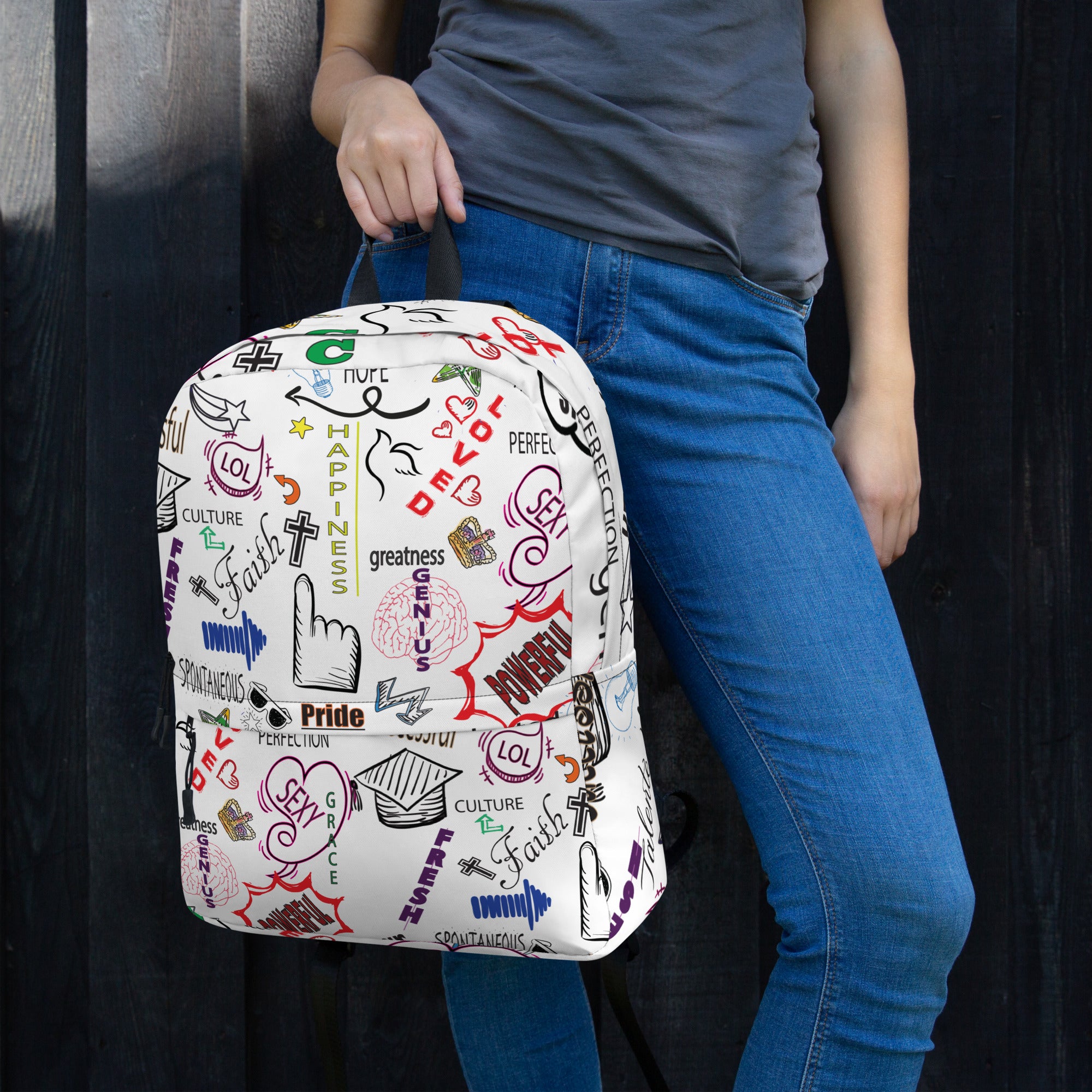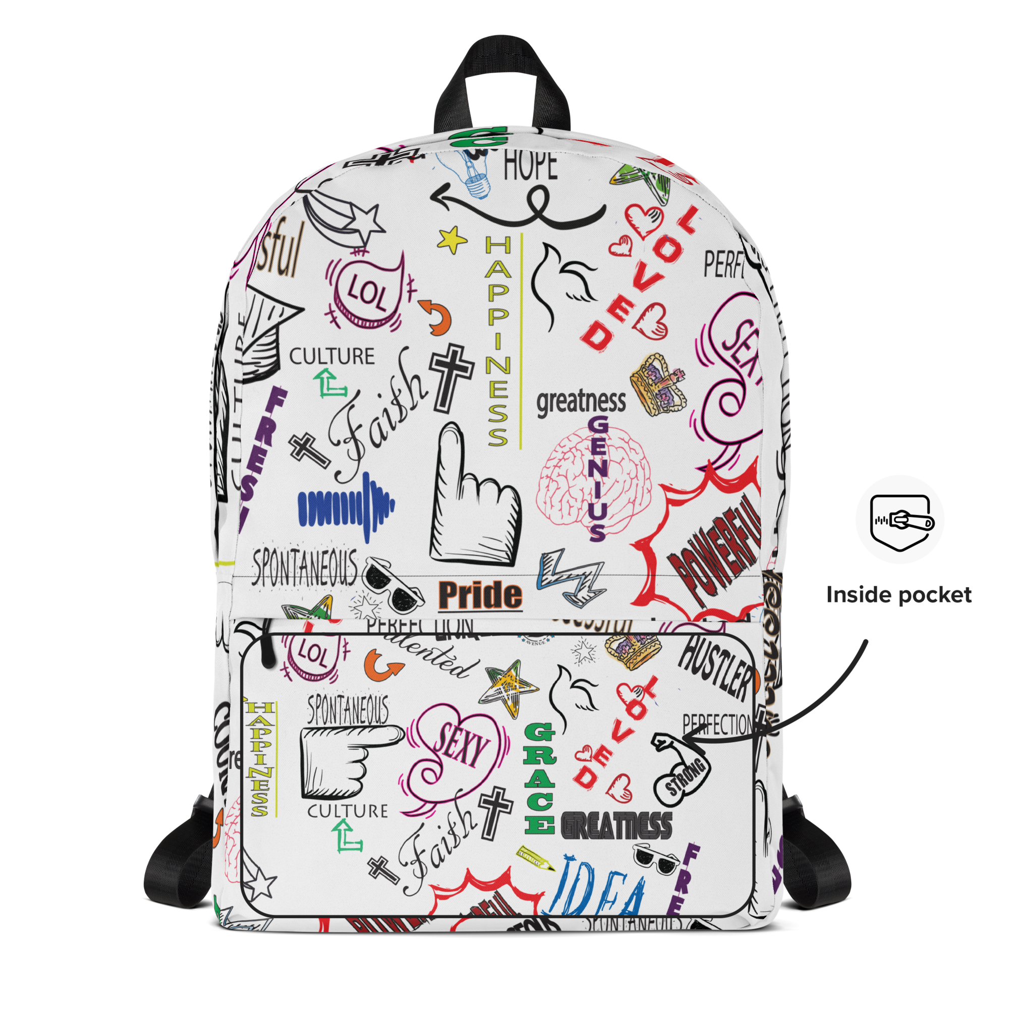 • Large inside pocket with a separate compartment for a 15” laptop, front pocket with a zipper, and a hidden pocket with zipper on the back of the bag